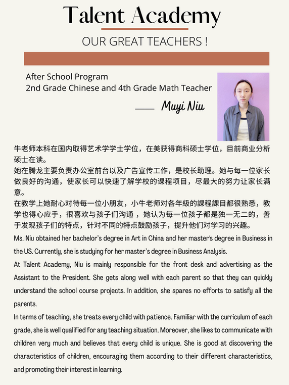 Talent Academy is a Mandarin Chinese language center that specializes in Mandarin education from early childhood. Mandarin Chinese is the most widely spoken language in the world and the third in the United States. As our world becomes more diversified and culturally interconnected, the proficiency in Mandarin Chinese will give our children a competitive advantage for the future.